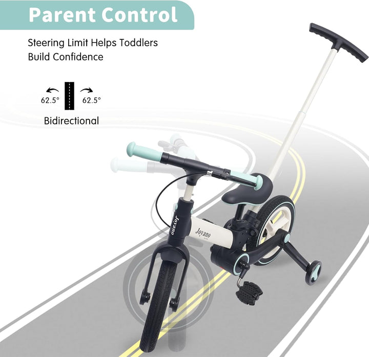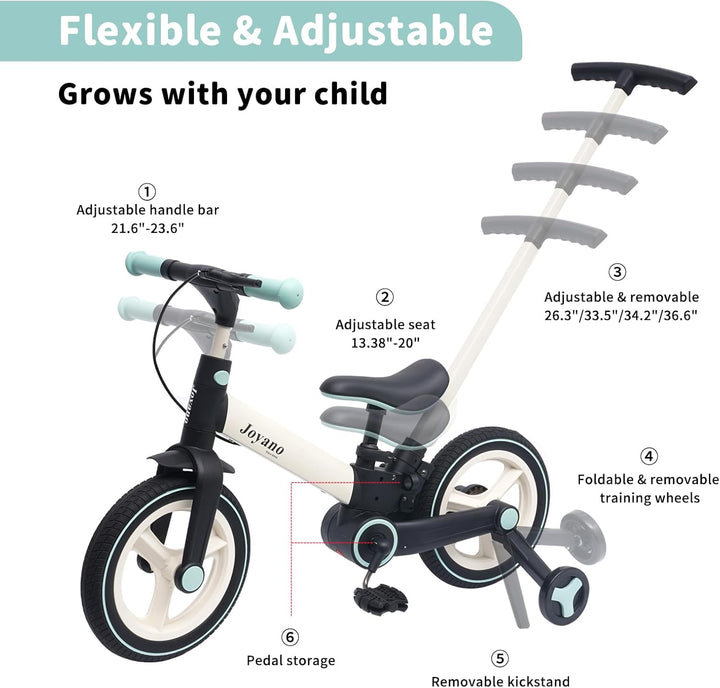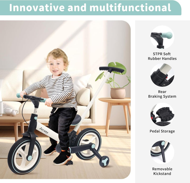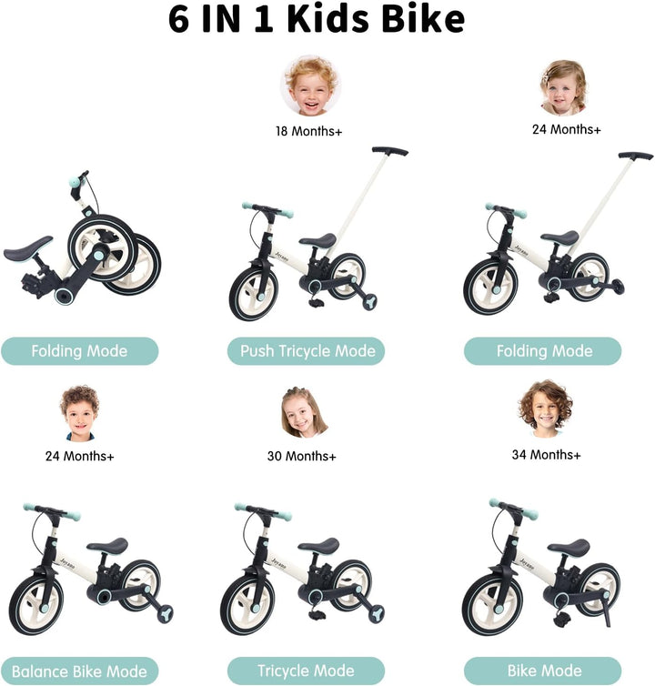 - 🛴 6 Modes for Every Stage of Riding Designed to grow with your child, the Joyano 6-in-1 Kids Bike easily transforms into six different modes: push bike, bike with training wheels, standard kids bike, balance bike, bike with kickstand, and a compact folded mode. Suitable for toddlers aged 18 to 60 months, it supports every stage of learning—from their first push to confident riding.